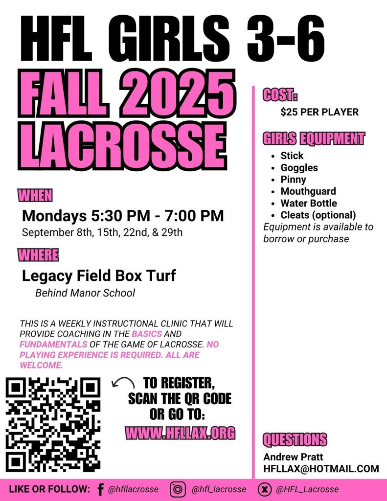 HFL Youth Lacrosse is excited to offer our Fall 2025 clinics for boys and girls in grades K–6! These weekly sessions are the perfect way for young athletes to learn the game, sharpen their skills, and build confidence — all while having fun with their teammates.